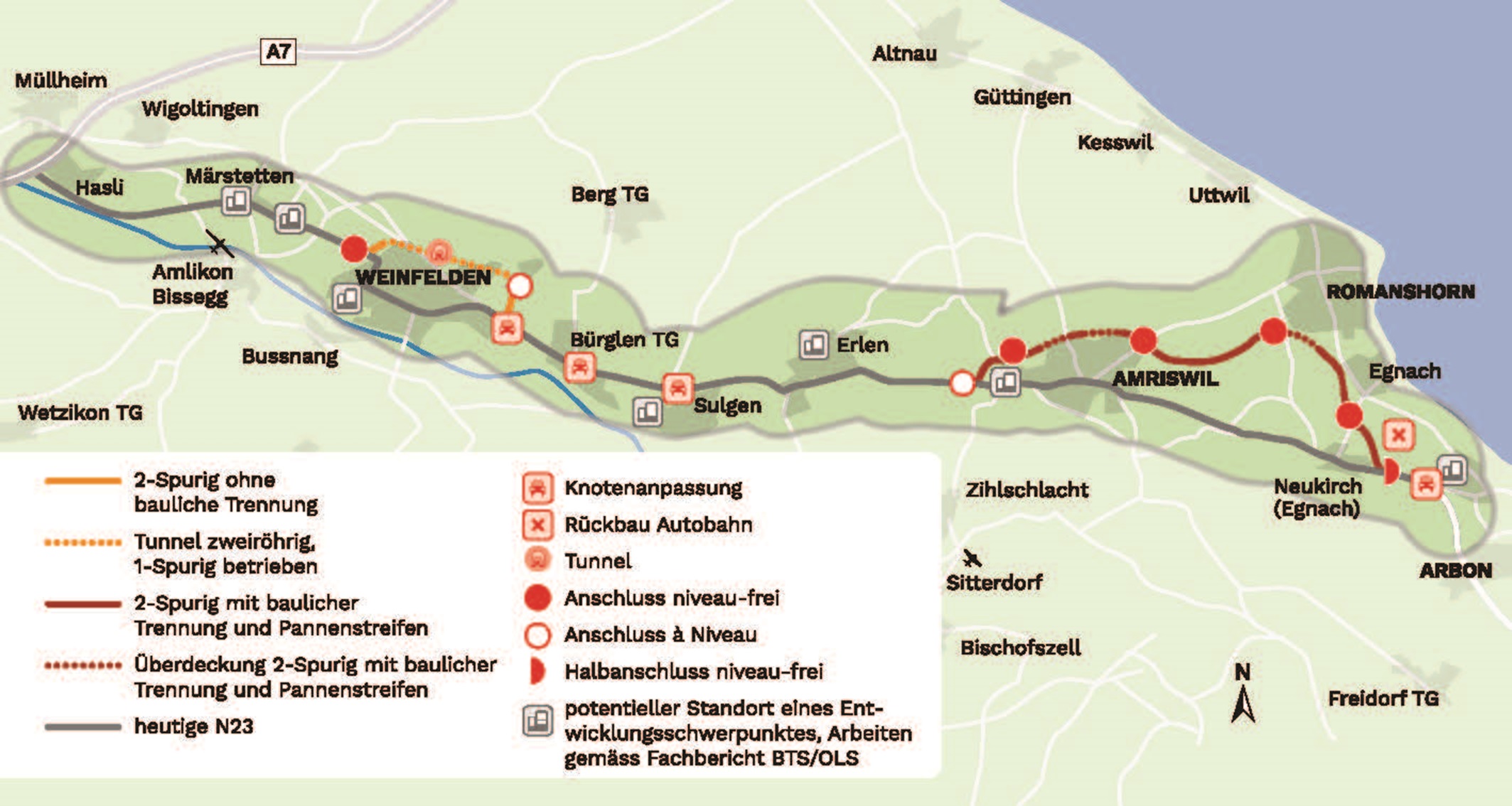 Die sich bereits seit Jahrzehnten in Planung befindliche und für den Kanton Thurgau entscheidende Verkehrsachse N23 von Arbon nach Bonau (Bodensee-Thurtalstrasse) wurde im vergangenen Jahr im Rahmen einer aufwändigen Korridorstudie und unter Beizug zahlreicher Akteure umfassend beurteilt. Die hohe bedarfsmässige Priorität der beiden verbliebenen Teilprojekte der N23 – die Umfahrungen Weinfelden und Amriswil mit Anschluss Romanshorn – wird für den kommenden Ausbauschritt der Strassen vom nun vorliegenden ETH-Gutachten anerkannt.