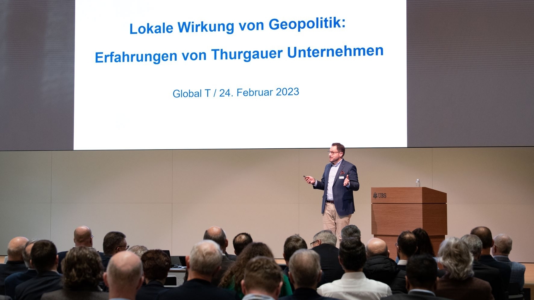 Just am Jahrestag der russischen Invasion in die Ukraine begrüsste Marcel Räpple, Leiter Wirtschaftsförderung des Kantons Thurgau, die teilnehmenden Vertreterinnen und Vertreter der Thurgauer Wirtschaft zu Global T auf dem Wolfsberg. Die Tagung, welche bereits zum elften Mal stattfand und sich an exportorientierte Unternehmen richtet, widmete sich dem Thema «International Wirtschaften unter Einfluss von Geopolitik». Veranstalter waren auch dieses Jahr die kantonale Wirtschaftsförderung und die Industrie- und Handelskammer Thurgau gemeinsam mit UBS als Sponsor und Switzerland Global Entreprise als Know-how-Partner.
