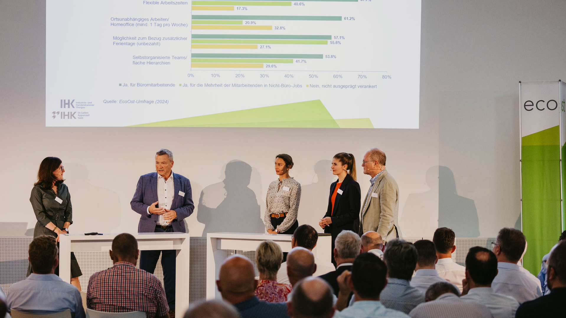 «New Work» hält Einzug in der Ostschweizer Wirtschaft. Das gilt längst nicht mehr nur für Grossunternehmen, sondern auch für KMU. Digitalisierung, Globalisierung und Multikrisen fordern Flexibilität und Agilität der Unternehmen. Neue Arbeitsformen wie flexible Arbeitszeiten, Teilzeitarbeit, Homeoffice oder flache Hierarchien sind ihn vielen Ostschweizer Unternehmen bereits Alltag: «Vier von fünf befragten Unternehmen in der Ostschweiz stellen im eigenen Betrieb einen Trend hin zu flexibleren und selbstbestimmteren Arbeitsformen fest. Diese verlangen auch nach neuen Fähigkeiten – sogenannten ‹Future Skills›», hielt Markus Bänziger, Direktor der IHK St.Gallen-Appenzell, bei der Begrüssung an der gestrigen EcoOst Arena in Romanshorn vor 180 Gästen aus Politik und Wirtschaft fest.