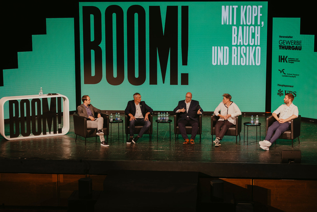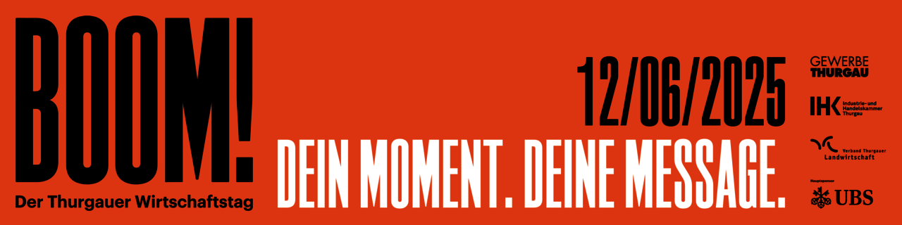 Die drei grossen kantonalen Wirtschaftsverbände - die Industrie- und Handelskammer, der Gewerbeverband und der Verband Thurgauer Landwirtschaft - veranstalten einmal jährlich «BOOM! Der Thurgauer Wirtschaftstag». BOOM! widmet sich jedes Jahr einem anderen Thema, das für Vertreterinnen und Vertreter der Thurgauer Wirtschaft und Gesellschaft besonders spannend ist. BOOM! ist einerseits eine Plattform zum Netzwerken, aber auch eine Bühne für hochkarätige und spannende Präsentationen und Podiumsdiskussionen. Sie bieten Initialzündungen, die zum Denken und Machen anregen.